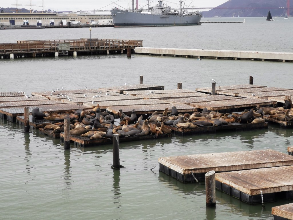 Als je er dan toch bent moet je over Pier 39 lopen, ook weer bezaaid met diezelfde souvenirwinkels die allemaal dezelfde prullen verkopen, restaurantjes, wat kermisattracties en andere kitsch. De pier is drukbezocht, in het weekend iets té drukbezocht, en de populairste attractie is misschien wel de kolonie Californische zeeleeuwen die hier leeft. Volgens geruchten zijn de zeeleeuwen dichter naar de pier gekomen na een zware aardbeving in 1989 en nam hun aantal snel toe. Booteigenaren begonnen te klagen over de dieren die toch wel wat stinken en voortdurend blaffen en grommen, maar al snel bleek dat de dieren hordes toeristen aantrokken. En nog steeds zijn deze rare dieren iets dat je moet gezien hebben als je hier bent.
