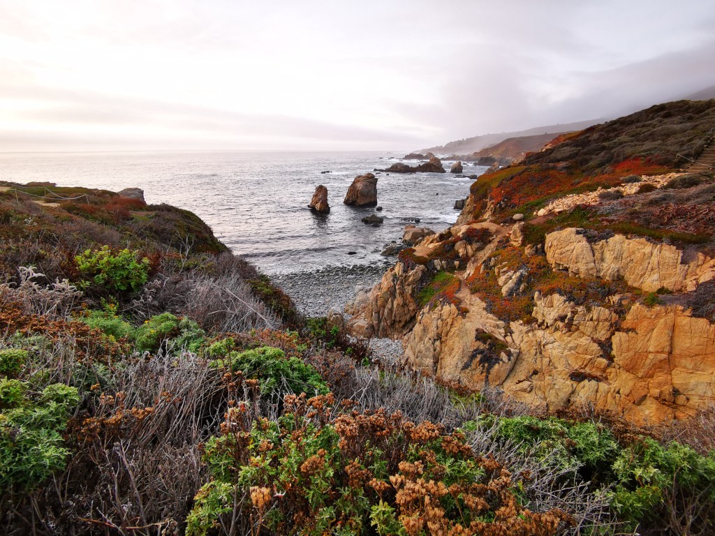 Langs Highway 1, de weg langs de kust die vaak genoemd wordt als één van de mooiste highways ter wereld, bevinden zich ontelbaar veel interessante stops.  Als je met een camper zou reizen, kom je fabelachtige kampeerplekjes tegen middenin het bos… even hadden we spijt dat we geen camper gehuurd hadden in plaats van een auto, iets dat we wel overwogen hadden. Wat ons wel verbaasde was dat bijna al die campings volboekt waren, het is laagseizoen en het toerisme staat nog steeds op een laag pitje wegens Covid, dus ik weet niet hoe het zou zijn in het hoogseizoen. Best op voorhand reserveren denk ik!  Als je Carmel of een ander dorpje langs deze weg als uitvalsbasis kiest, kan je hier makkelijk een maand blijven en elke dag een andere wandeling doen.  De natuur is ontzagwekkend prachtig en divers, voornamelijk bij “Big Sur”, een gebied tussen de Carmel River en de bergketen Santa Lucia Range.