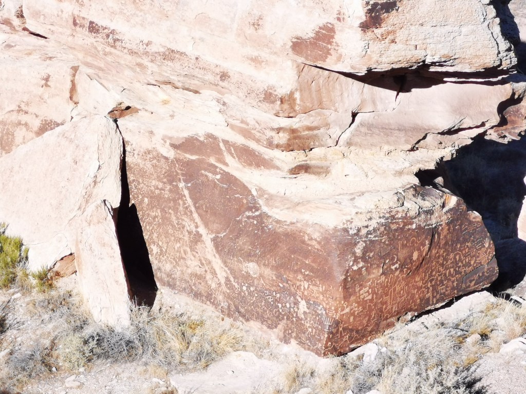 In het park werden ook op verschillende plekken overblijfselen gevonden van oude beschavingen: Native Americans die hier zo’n 2000 jaar geleden leefden, lieten een massa Petrogliefen achter op wat men nu “Newspaper Rock” noemt. Ik voeg een foto toe bij de blog. Op het eerste gezicht is het een gewone grijze rots, maar als je beter kijkt en misschien even inzoomt, zie je talloze figuurtjes, spiralen, dierenfiguren enzovoort in de stenen gegraveerd staan.