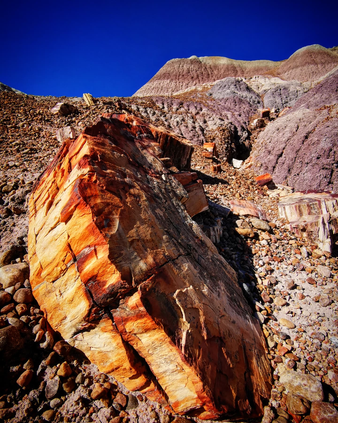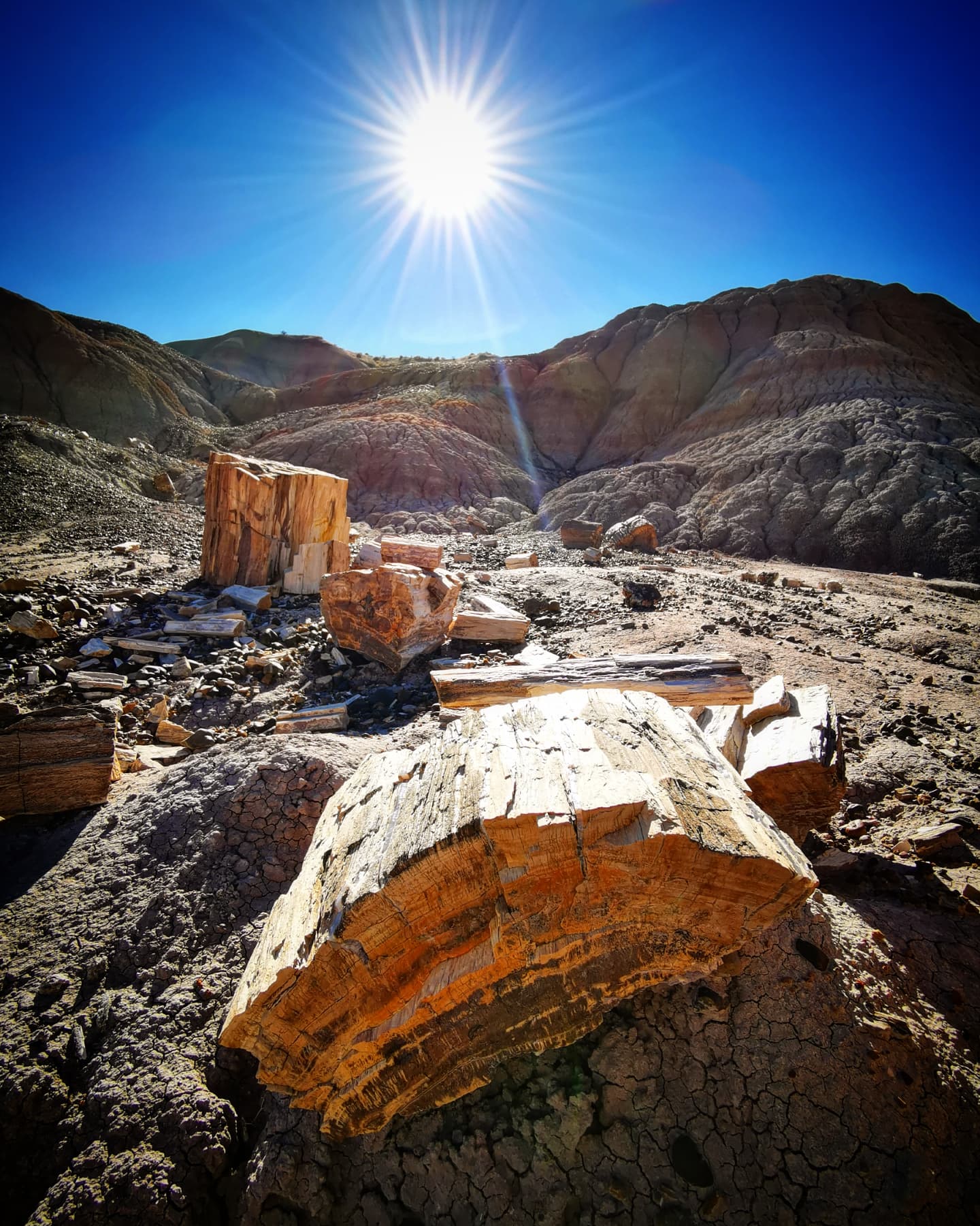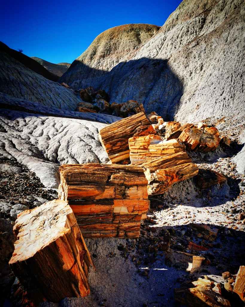 Het is heel moeilijk te beschrijven hoe apart dit is. We blijven maar foto’s maken, wetende dat dit totaal niet zal overkomen zoals we het zouden willen. Op de foto lijken het gewoon wat houten boomstammen in een desolaat en droog woestijnlandschap, maar telkens je zo’n stronk of stuk hout ziet sta je weer versteld want als je je hand erop legt is het zuiver steen. Je voelt gewoon de kracht en energie van al die miljoenen jaren. Zo bijzonder!