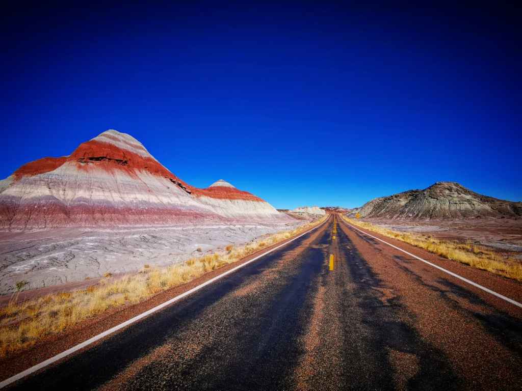 Je komt langs wonderlijke landschappen in “The Painted Desert”, dat zijn naam dankt aan de zandsteenformaties in verschillende tinten rood, bruin en paars. Prachtig!