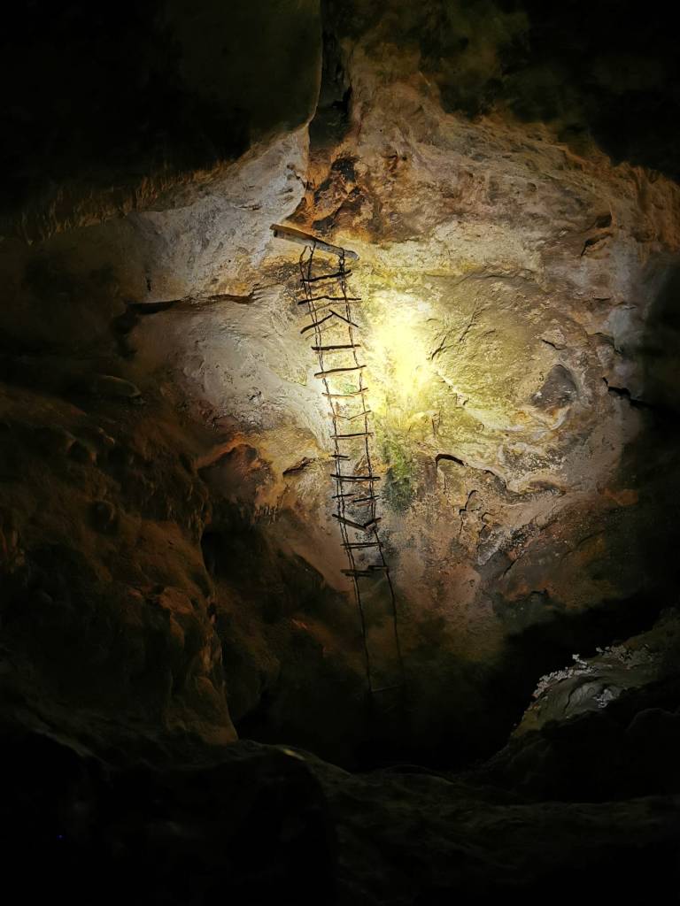 De afdaling is relatief gemakkelijk, er is een vlak pad gemaakt en er zijn relingen, en je doet er ongeveer een uur over, misschien iets langer omdat je je de hele tijd vergaapt aan de prachtige omgeving. Nu hebben al verschillende mensen ons gevraagd waar we onze foto’s mee maken. Wel, het is géén spiegelreflex en we hebben ook helemaal geen fototoestel bij. We hebben vorig jaar allebei een Huawei P30 gekocht, vooral omdat die fantastische foto’s maakt, en omdat we zo licht mogelijk wilden reizen zijn die telefoons dan ook het enige cameramateriaal dat we bijhebben. We hebben er al heel mooie dingen mee gedaan, maar grotten fotograferen? Helaas, het komt helemaal niet over zoals het is. We voegen een paar foto’s toe aan de blog maar oordeel alsjeblief niet aan de hand van die foto’s. Laat je verbeelding werken: Jullie zijn waarschijnlijk allemaal ooit weleens naar de Grotten van Han geweest, het grootste grottencomplex van Europa en een fabelachtig mooi stukje België… denk daaraan, maar dan véél groter, en meer dan dubbel zo diep onder de grond!