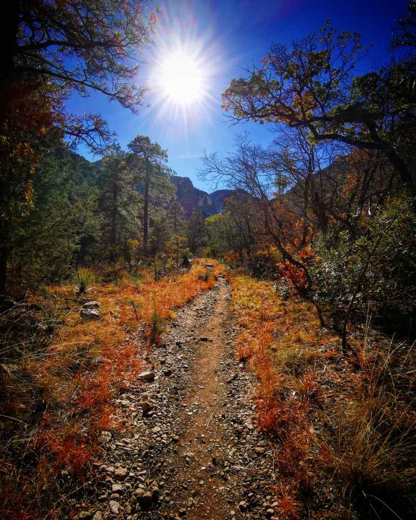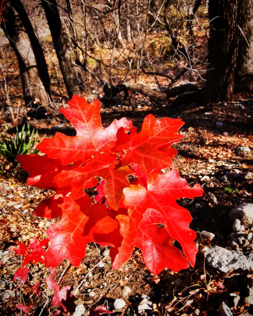 We zijn al december, dus aan de late kant, maar doordat de temperaturen hier zachter zijn zien we toch nog een paar laatste restjes in enkele moedige esdoorns die hun prachtige rode bladeren nog hebben vastgehouden. Het is nu al zo mooi, een maand geleden moet het echt fenomenaal zijn geweest! De McKittrick Canyon trail is een trail die met een poort afgesloten wordt vanaf 16u30.