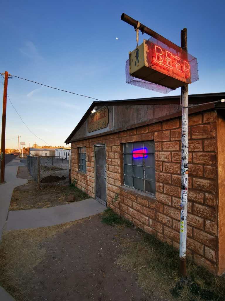 De bar nodigt aan de buitenkant niet echt uit om binnen te komen, het is een stenen huis met gordijnen die potdicht zitten, maar de neonverlichting met “open” en “beer” brandt, het schijnt een populaire bar in Marfa te zijn en… nou ja, het is de enige die open is.