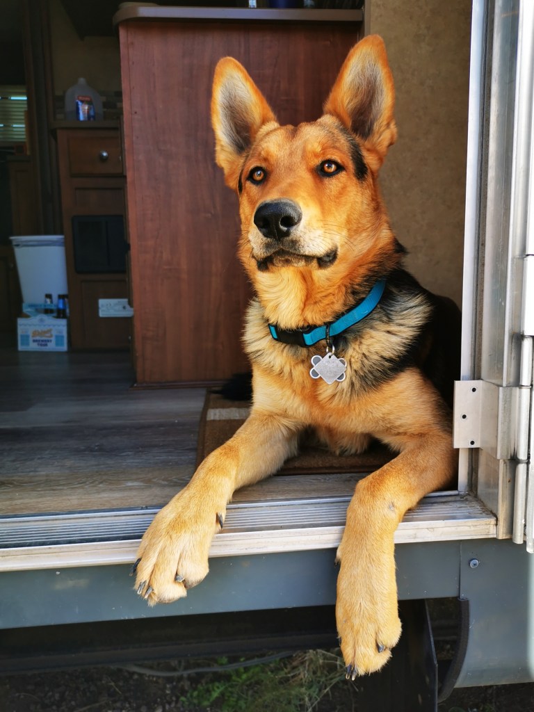 Er lopen ook nog drie honden rond.  Een klein blaffend scharminkeltje dat ons geen ogenblik heeft vertrouwd, kleine Ziggy wiens vertrouwen we pas wonnen op het moment dat we terug vertrokken en een prachtige Duitse Herder die Gretchen heet en één brok liefde is.  Ze stond ’s ochtends meteen aan de deur van onze caravan en kwam ons van liefdevol gezelschap voorzien.