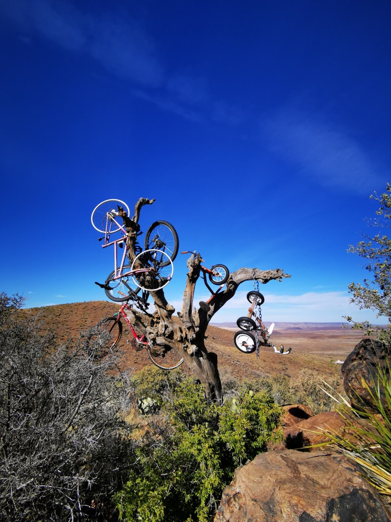 Het eerste is Alpine.  Een klein lieflijk stadje met een paar historische gebouwen en veel kleurrijke muurschilderingen.  En je kan er een wel heel bijzondere wandeling doen naar de top van Hancock Hill!  Het is een klim van ongeveer een klein halfuurtje en je komt eerst “The bicycle tree” tegen, letterlijk een boom waar een paar fietsen in hangen.  Vanaf daar is de top van de heuvel een paar meter verder en daar staat dan opeens… een metalen bureau en een stoel.  In 1981 besloten drie studenten van  Sul Ross State University om deze bureau helemaal naar de top te dragen, zogenaamd om een rustige plek te vinden om te studeren.  Er lag een notitieboek in één van de lades en op een dag toen één van de studenten bij het bureau kwam, merkte hij dat iemand anders er iets had ingeschreven.  Zo ontstond een traditie waarin allerlei mensen, studenten, wandelaars, gelijk wie… hun diepste gevoelens, gedichten, moppen enzovoort in het notitieboek begonnen te schrijven.  Tot op de dag van vandaag gebeurt dat nog steeds.  Het bureau zelf is inmiddels ook volgeschreven, maar in de lade vind je een aantal notitieboekjes waar je iets kan inschrijven.  Als er een schrift vol is, wordt het bewaard in de Archieven van Big Bend, op de Universiteit zelf.  Daar ligt ook het eerste originele notitieboek.  Het is best een bijzondere plek, maar we blijven ons afvragen wat een hels karwei het moet zijn geweest om die zware bureau langs een pad vol losliggende keien helemaal naar boven te dragen!  The Desk of Hancock Hill is in elk geval iets dat je zeker gezien moet hebben als je dan toch in Alpine bent.