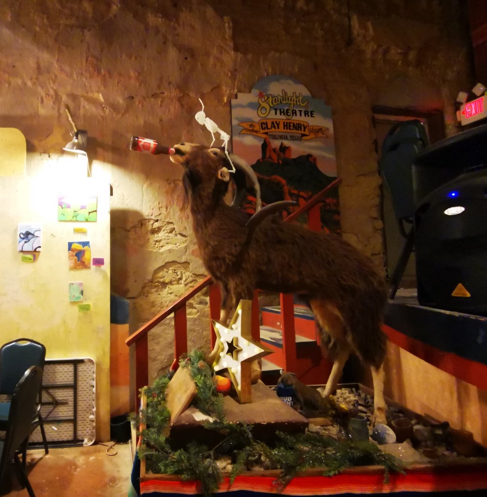 Vooraan bij het podium staat de eerste burgemeester van Lajitas opgezet met een bierflesje in zijn bek. Voor wie de vorige blog gemist heeft: burgemeester Clay Henry de eerste was een bierdrinkende geit.