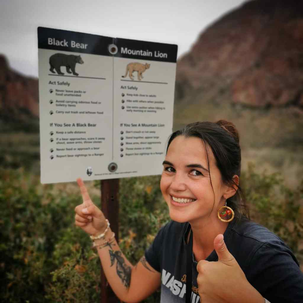 We waren nog maar net aan die terugweg begonnen, flink doorstappend, toen ik uit mijn ooghoek iets zag en dacht “oh, mensen”. Maar ik keek op en bleef verstijfd staan: “Robbie, een beer!!” Daar stonden we dan, oog in oog met een mama beer en twee welpjes, midden op ons pad, op nog geen 10 meter afstand, veel te dicht dus! Dankzij alle informatieborden die in alle nationale parken staan wisten we wat we moesten doen en dat gebeurde eigenlijk ook instinctief. We gingen rustig achteruit maar hadden niet verwacht dat de nieuwsgierige beer onze richting zou uitwandelen. Even paniek want zwarte beren zijn dan wel niet heel agressief, maar als ze kleintjes hebben moet je toch altijd wel uitkijken. Dus we stapten het dichtstbijzijnde heuveltje op en namen elk een steen vast om haar af te kunnen schrikken mocht het nodig zijn. Let wel: nooit de beer proberen raken, stenen gooien doe je echt enkel om hen op afstand te houden. Gelukkig was het in ons geval niet nodig want al snel ging ze terug de rivierbedding in en probeerde haar kleintjes te roepen. Inmiddels kwamen er twee andere nietsvermoedende wandelaars aan, dus wij maar roepen: “Guys! Be careful, there’s a bear over there!”, maar ze hadden niet door dat we het tegen hen hadden en pas toen ze bijna bij ons waren viel het kwartje. Ze waren net zo onder de indruk als wij en we hebben geduldig gewacht tot de beer en haar welpjes gepasseerd waren. Het was eigenlijk een droom van ons om tijdens deze reis zwarte beren te zien, maar we hadden het echt niet meer verwacht in Texas. Kippenvelmoment en zonder twijfel één van de hoogtepunten van deze reis!