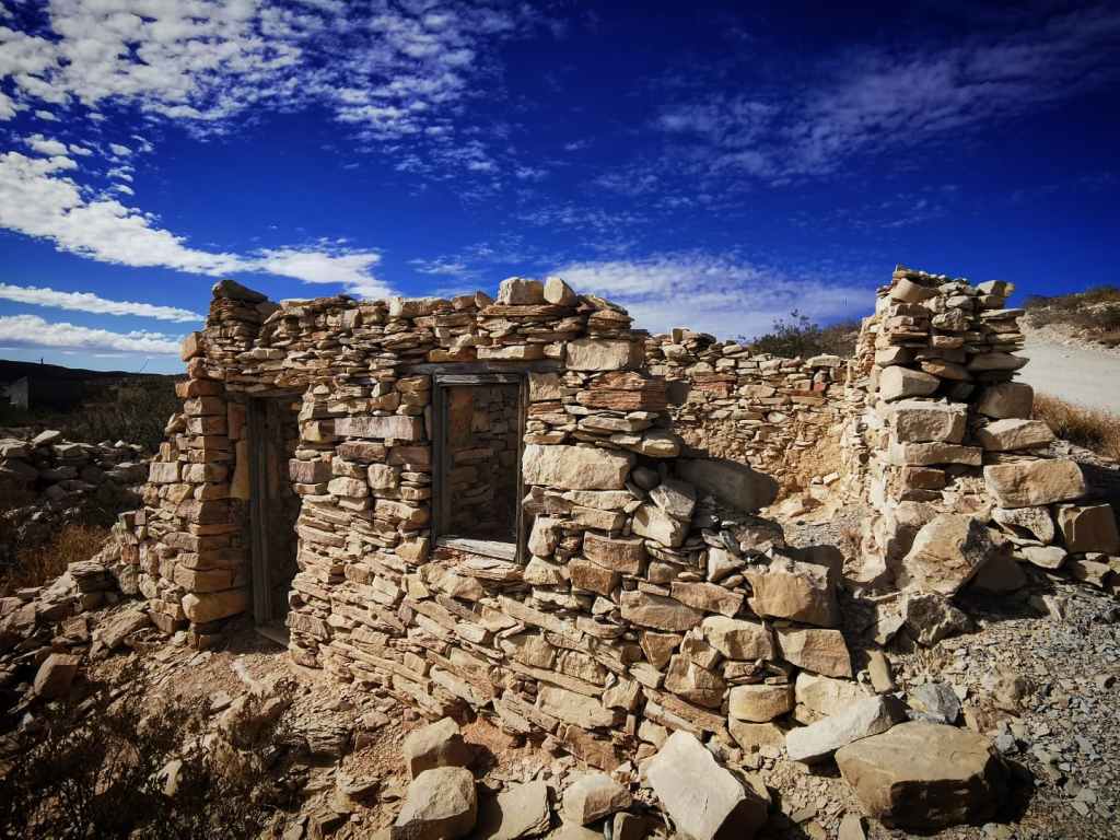 Rondwandelend door Terlingua zie je overal nog ruines van oude mijnwerkerswoningen, er zijn nog een paar oude mijningangen en bij één ervan staat zelfs nog zo’n oude lift waarmee de mijnwerkers de diepte in werden gestuurd.