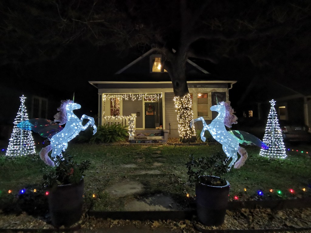 Een avondwandeling in december kan je doen langs 37th street, waar de “lights on 37th street” jaarlijks duizenden mensen lokken om naar de overdadig versierde en verlichte huizen te kijken. De traditie begon in de jaren ’80 en gaat nog steeds verder. Er zijn voortuinen met prachtig verlichte eenhoorns, opritten die afgezet zijn met lollypop lichtjes, er is een zoo van knuffeldieren, een lichtkoepel waar je kan hoelahoepen, door lichtjes gewurgde poppen in een boom, een kerststal van gehaakte aapjes… supertof en heel erg Austin!