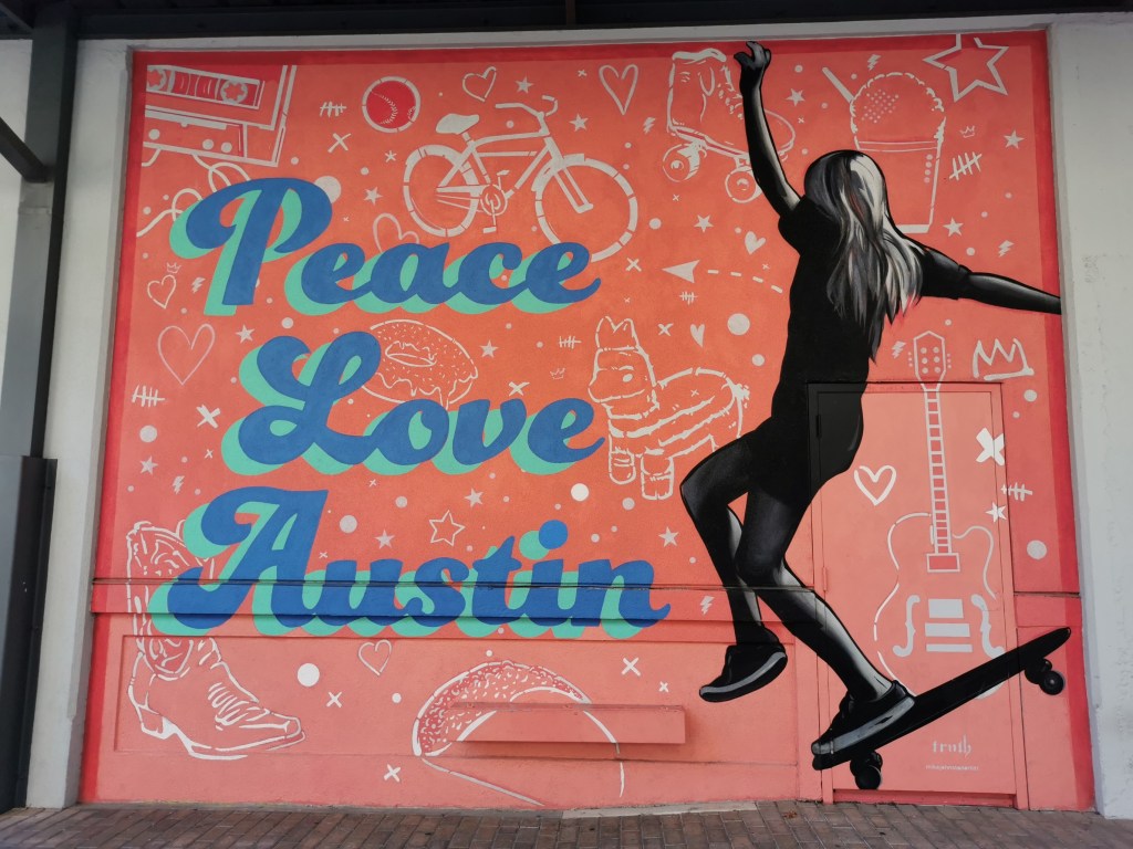 De Street Art heeft ook zo zijn eigenaardigheden. Er is wel wat graffiti te vinden, zoals de zwarte muur waar Love from Austin opstaat binnen de lijnen van de vorm van Texas, het portret van Willie Nelson met de tekst “Willie for president” op een muur in SoCo, en nog in SoCo zowat de bekendste graffiti van de stad: “I love you so much”, rode letters op een groene muur, werd in 2010 door lokale muzikante Amy Cook op de muur van Jo’s Coffee gespoten. De betekenis is eenvoudig, het was een liefdesverklaring aan haar vriendin die mede-eigenares is van de koffiebar. Maar de graffiti werd opgemerkt en ging viraal. Nu is het vaak aanschuiven geblazen om een foto te nemen met de mooie woorden, en in elke souvenirshop vind je spullen met een foto op van de graffiti.