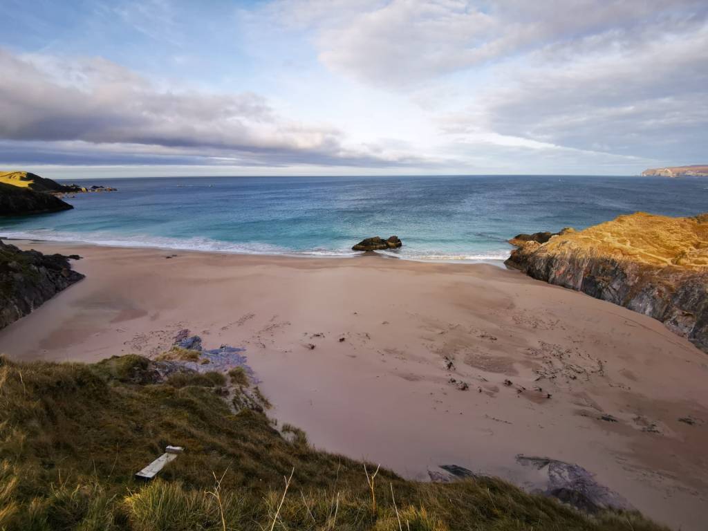 Maar Durness is anders. Onze camping is gelegen langs de dramatische kust en een aantal oogverblindende strandjes. Turkooizen golven storten zich vol overgave te pletter op de rotsen.