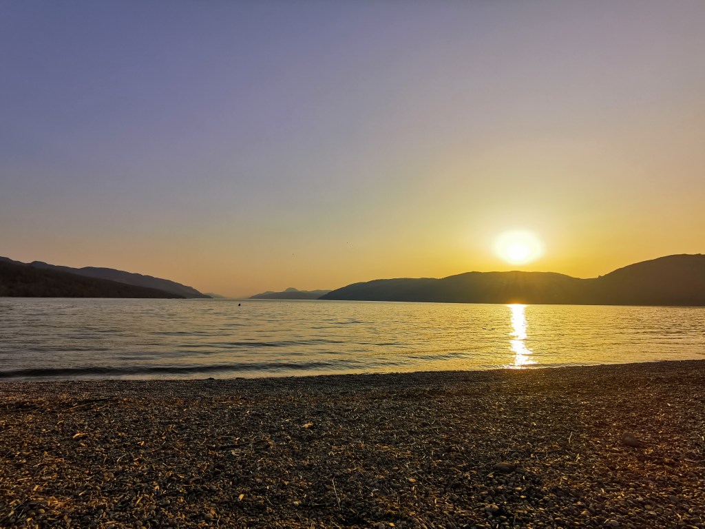 We maken ons hoofd nadien leeg aan een klein strandje aan Loch Ness, voor een laatste mooie zonsondergang hier. We hebben al ontzettend veel geluk gehad. Het typisch Schotse weer blijft ons voorlopig bespaard, en overdag in het zonnetje is het vaak heerlijk lenteweer zolang de frisse wind wegblijft, maar een jasje moet je toch echt in de buurt houden. Schotten, hebben we al gemerkt, zijn echter een bijzonder taaie soort. Er zijn dagen geweest waarop het 6 graden was: we zagen meisjes in minirokjes en mannen in t-shirts, en bij verschillende huizen hing de was vrolijk buiten te drogen! Vandaag is het lekker weer geweest, tot wel 18 graden, maar ’s avonds bij het meer is het echt heel fris, en het water is berekoud. Toch zien we 2 meisjes in short en t-shirt het meer opgaan op een paddleboard. En nog straffer is de vrouw in badpak die even rustig een paar baantjes gaat zwemmen! Rare jongens, die Schotten!