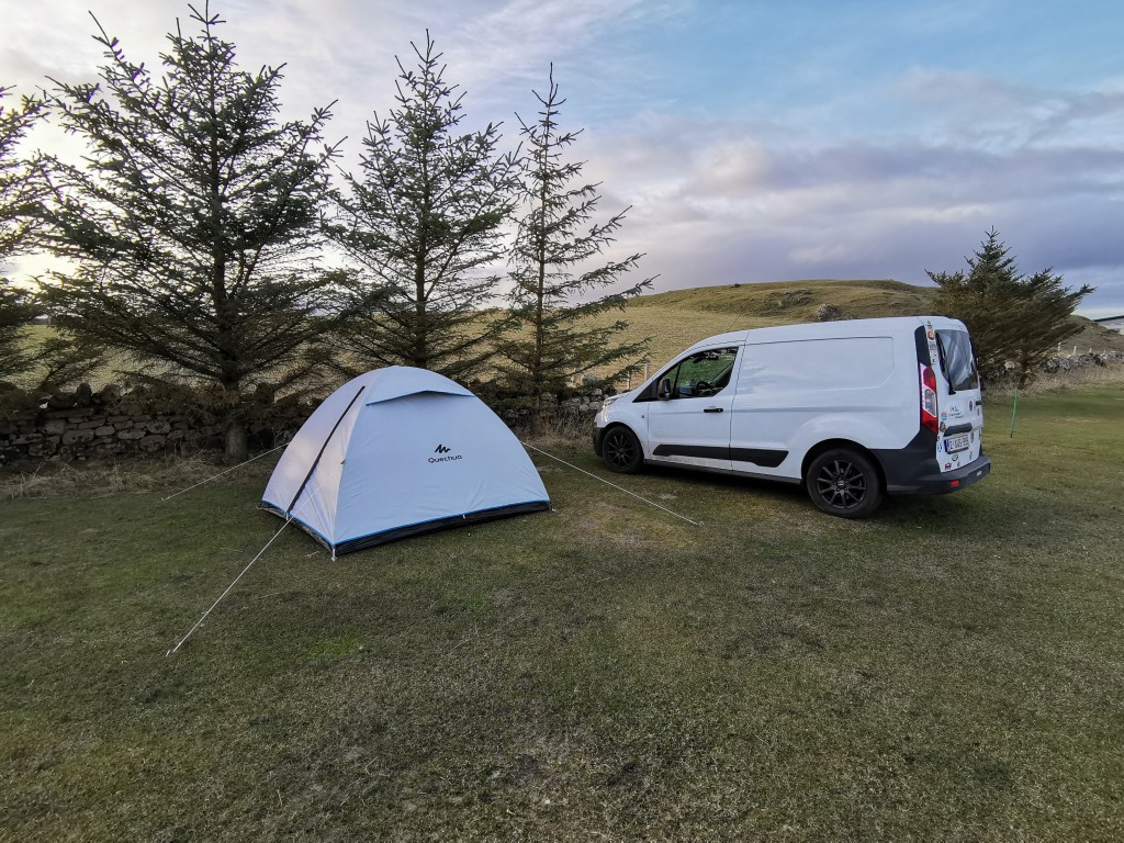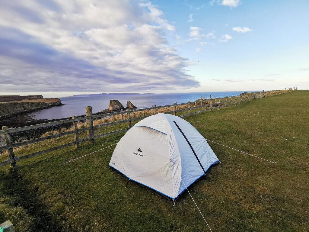 We maken een paar foto’s en rijden door naar onze volgende bestemming: Dunnet. Omdat we met onze eigen auto zijn konden we wat extra spullen inpakken en dus besloten we ook onze tent, slaapzakken etc in te pakken. Dunnet is een dorpje vlakbij Dunnet Head, het meest noordelijke punt van het Britse vasteland. Veel accommodatie is er niet deze tijd van het jaar, maar we vonden een leuke kleine camping met een schitterend zicht op de kliffen en de zeehondjes die beneden op het keienstrand liggen te luieren. Op een Duits gezin met een camper na, zijn we de enige gasten, dus het is heerlijk rustig. De eigenaars hebben twee honden: een ongeïnteresseerde husky die Sky heet, en Billy, een pracht van een Border Collie die continu wil spelen. We vallen ’s avonds in slaap onder het ruisen van de golven en worden wakker met het gekrijs van de meeuwen en Billy die een aai wil.