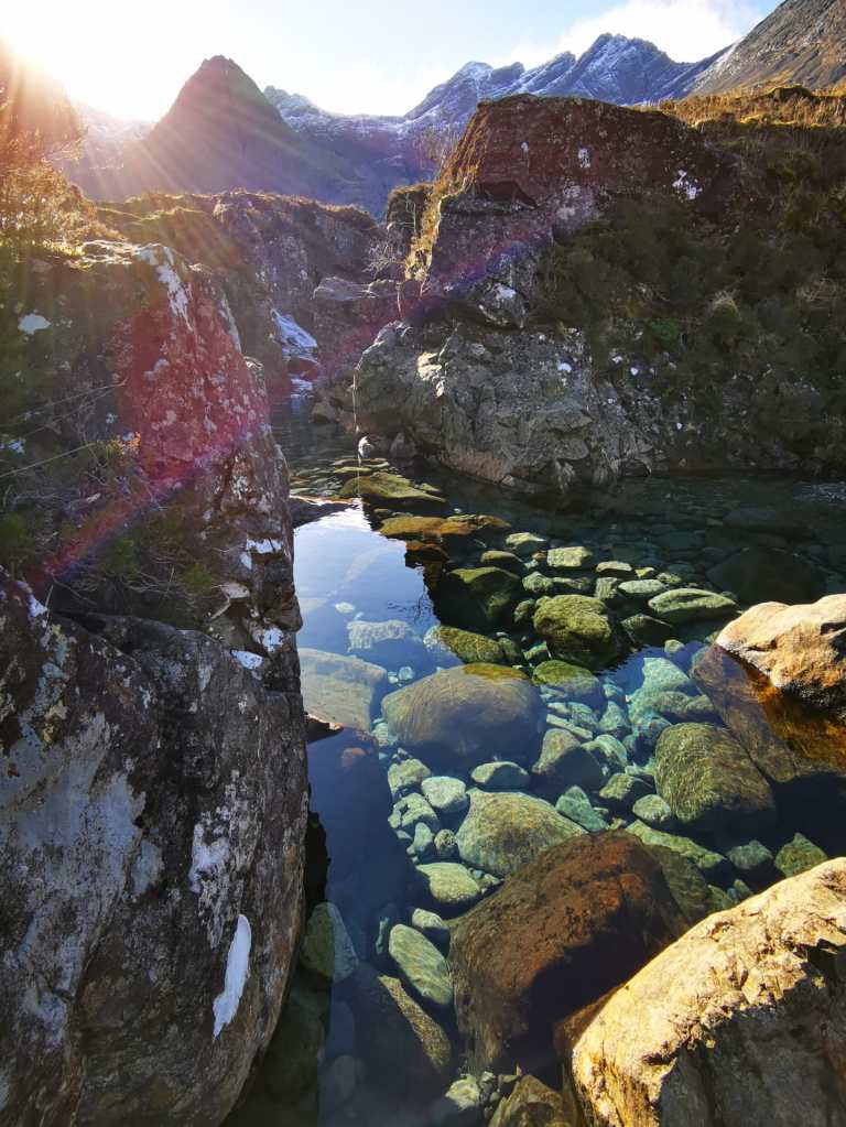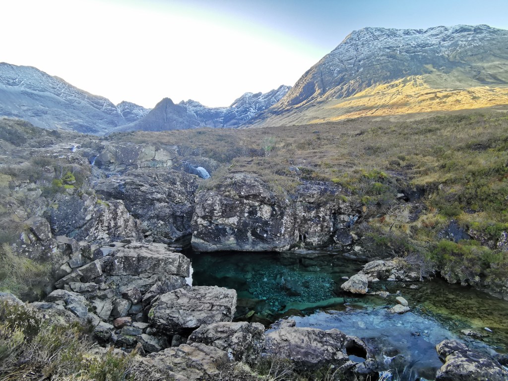 Dan heb je nog de Fairy Pools. Een mooie wandeling vanuit Glenbrittle brengt je langs verschillende kristalheldere natuurlijke poeltjes, gevoed door een reeks kleine watervallen die ontspringen in het Cuillin gebergte. Het is een prachtig en spectaculair zicht, maar je moet met enkele dingen rekening houden: ga enkel bij mooi weer, dan reflecteert de zon in het water en komt het natuurlijke aquamarijn van het water het best naar boven. Ook is de wandeling bij zware regenval veel moeilijker, want je moet op een paar punten een klein riviertje oversteken. Als het droog is, is dit prima te doen door de stepping stones in het water.