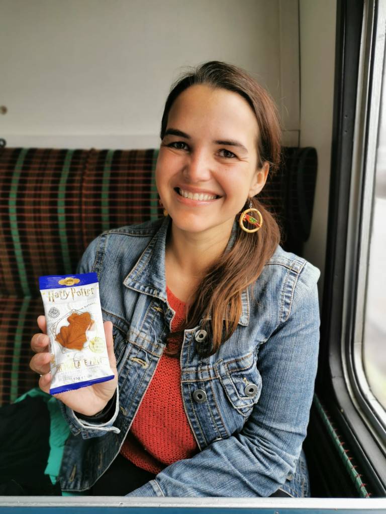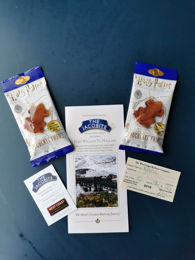 De trein vertrekt ’s ochtends om 10u in Fort William, komt om 12u20 aan in Mallaig, waar een paar pubs zijn om te lunchen, en vertrekt om 14u10 weer terug naar Fort William. Je zit dus eigenlijk gewoon een hele dag op de trein, maar toch is het een hele beleving. Ondanks het rotslechte weer is het een prachtige rit, en wanneer de trein traag over het beroemde Glennfinnan Viaduct rijdt en daar wat extra stoom maakt om de honderden mensen die in de berm staan te kijken blij te maken… dat is kippenvel. Net als in de verhalen komt er een karretje langs dat chocolade kikkers met een tovenaarskaart bij om te verzamelen verkoopt, en natuurlijk ook smekkies in alle smaken, inclusief snotsmaak, wormsmaak en oorsmeersmaak!