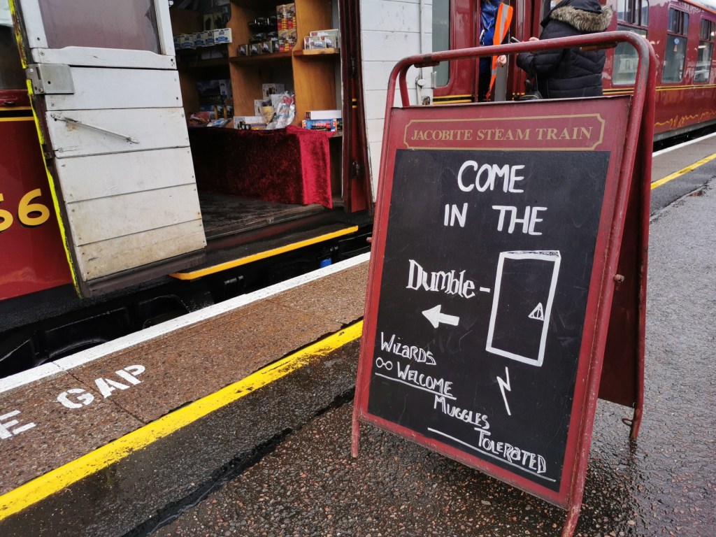 De trein zit natuurlijk vol met mensen die van Harry Potter houden. In onze wagon zit een koppel met Gryffindor sjaals aan en een hond die Harry heet en een Gryffyndor das draagt. Niemand zit hier verveeld op een smartphone of Ipad te scrollen, iedereen kijkt geboeid naar buiten en is opgewonden omdat we allemaal het gevoel hebben dat deze trein ons echt naar Hogwarts gaat brengen. De rit met de Jacobite is een dagvullende activiteit, en zeker een aanrader. Het is een beleving, en niet enkel voor Harry Potter fans. Als je op voorhand boekt kan je kiezen uit verschillende prijsklassen, van het standaardticket, tot een peperduur luxe compartiment in Harry Potter stijl. We kunnen je vertellen dat de standaardklasse zeker comfortabel en spectaculair genoeg is, we hebben de luxe compartimenten gezien en denken niet dat ze hun geld waard zijn. De magie hangt echt over heel de trein.