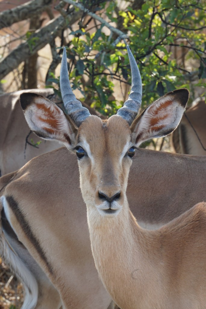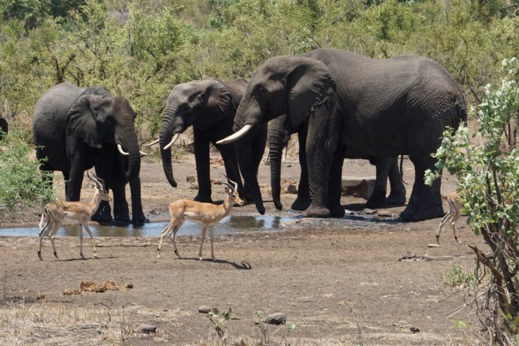 We rijden uren en uren in het park, zien talloze giraffen (die gaan echt nooit vervelen), massa’s olifanten (Annemie heeft er wat schrik van en dat is een beetje terecht, als je door het park rijdt moet je altijd alert zijn voor olifanten die dicht bij de weg staan, vooral als ze kleintjes bijhebben! Maar desalniettemin blijven deze mastodonten prachtig om te zien), we zien ook tal van bijzondere grote vogels, een drietal leeuwen in de verte, buffels, véél zebra’s en wildebeest (ook wel gnoes genoemd), en zoveel soorten antilopen zoals klipspringers, steenbokjes, kudu’s en impala’s. Deze laatste is volgens ons zowat het meest onderschatte dier in heel Afrika wat schoonheid betreft. Er zijn er zo gigantisch veel van, bijna niemand stopt voor een foto van een impala. Terwijl ze zo prachtig zijn met hun elegante loopje en hun wondermooie grote zwarte ogen. Ze zijn zowat het toppunt van puurheid en onschuld. Prachtige dieren!
