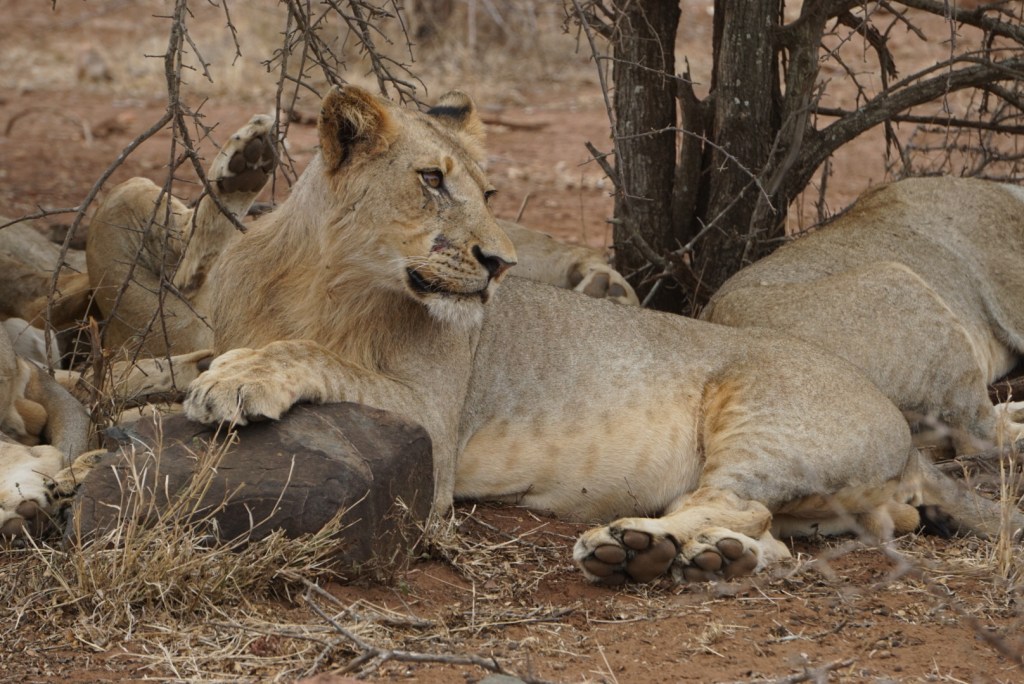 Dit is zo bijzonder… ze lijken onze aanwezigheid totaal niet storend te vinden en we nemen al onze tijd om hen in verwondering te observeren en foto’s te maken. We hebben nog nooit leeuwen van zo dichtbij gezien, zelfs Sam is onder de indruk, en zij kent het Krugerpark op haar duim.