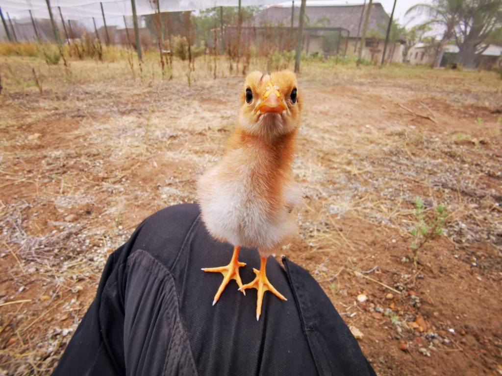 Er werd besloten dat hij moet leren hoe hij een kip of haan moet zijn (het is nog te vroeg te bepalen wat het zal worden). We mogen niet meer teveel met hem spelen en hem niet meer teveel aanhalen. We gaan overdag een paar keer met hem naar de kippenren, waar hij vrolijk achter ons aan wandelt, als we weggaan zetten we hem in zijn aparte kooi in de kippenren, en ’s nachts slaap hij in zijn grote emmer in onze kamer. Maar het moet beter.
