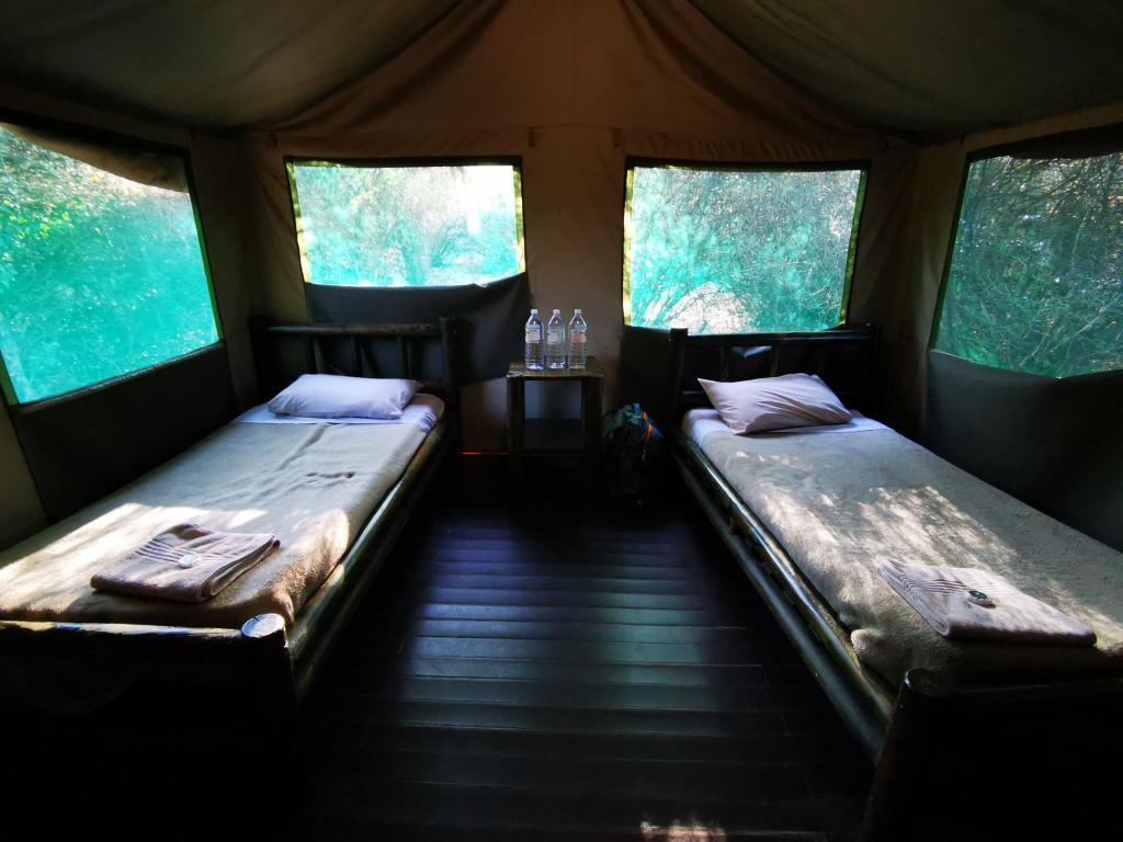 Wanneer we om 5u30 het kamp verlaten is dat met een gevoel van voldoening en verwondering. Ondanks het gebrek aan een muskietennet hebben we heerlijk geslapen in de tent, en het was puur genieten om je tijdens de nacht bewust te blijven van alle geluiden. We hoorden hyena’s, bavianen, krekels, uilen en andere vogels, en er kwam geregeld een mysterieuze bezoeker aan onze tent krabben. We hoorden ook een voor ons onherkenbaar dierengeluid bij onze tent, toen ik het beschreef aan Sam bleek het een Afrikaanse civetkat te zijn geweest! Deze nacht staat absoluut in onze top 5 van meest bijzondere overnachtingen die we ooit gehad hebben. Zelfs Annemie, die hiermee alweer een grote stap uit haar comfortzone heeft gezet en bovendien helemaal alleen in haar tent moest slapen, zegt: “het is geen Van der Valk, maar ik vind het zeker even leuk!”