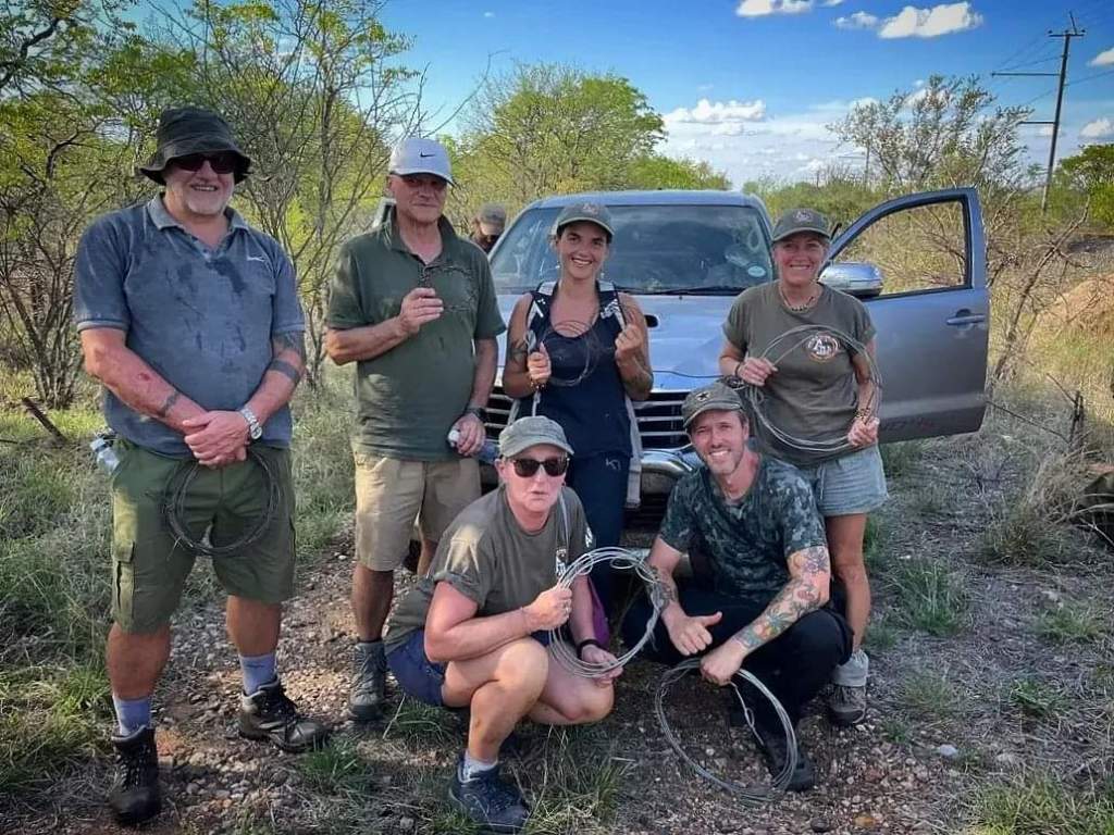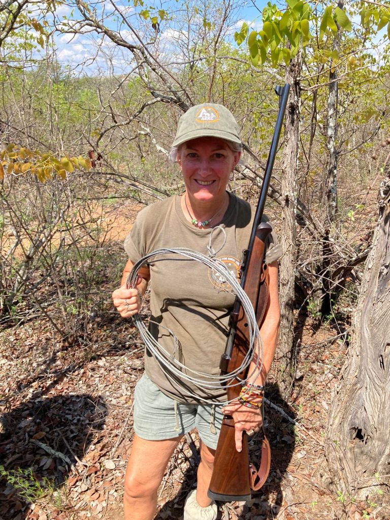 De wapens zijn uiteraard niet bedoeld om dieren dood te schieten, wel om ze af te schrikken. Maar mocht er toch gevaar dreigen voor het leven van één van ons, kunnen ze wel ingrijpen. Het is enorm belangrijk dat we allemaal op een rij blijven, en ons aan dezelfde snelheid bewegen. Maar je kan niet altijd rechtdoor lopen in de dichtbegroeide bush, en dus dwaalt er weleens iemand af. Daarom moeten we nu en dan de naam roepen van de persoon die zich links en rechts van ons bevindt. Als er ”hold the line” wordt geroepen, moeten we wachten. Soms is dat omdat er een snare werd gevonden, een andere keer omdat er verderop buffels werden gezien. Wanneer er een snare gevonden wordt, krijgen we de opdracht om het gebied rond die snare te doorzoeken. De kans is namelijk groot dat stropers verschillende valstrikken hebben gelegd in hetzelfde gebied.
