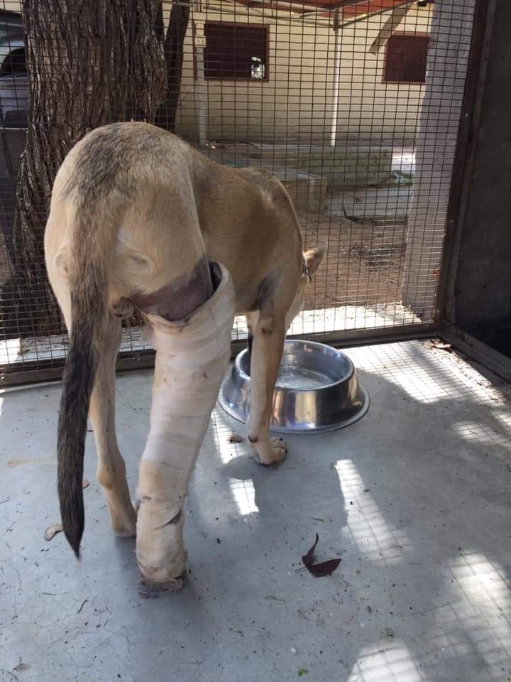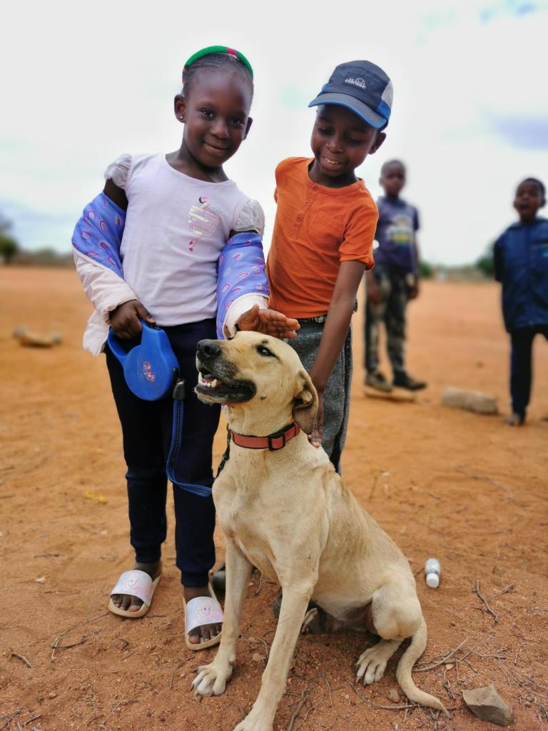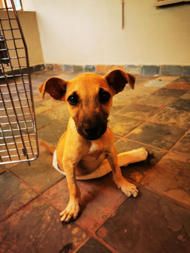 Intussen zijn de 4 honden die we meenamen van de outreach weg bij de dierenartsenpraktijk. Bushy werd al teruggebracht naar haar eigenaar. Haar foetus werd verwijderd en ze is weer helemaal gezond. Tau en Bruno (die we ook wel Dobby noemen vanwege de gelijkenis), blijven hier minstens 6 weken, zitten met hun poot in het gips en moeten strikte kooirust houden. Dit wil zeggen dat ze allebei in een relatief klein hok moeten blijven en absoluut niet mogen springen, spelen, rennen… Heel moeilijk voor 2 jonge enthousiaste hondjes. Als we hen er uit laten voor hun eten en medicatie en een plaspauze, mogen we hen gelukkig wel knuffelen, al gebeurt dat best zittend, zodat ze niet de neiging hebben om tegen je aan te springen.