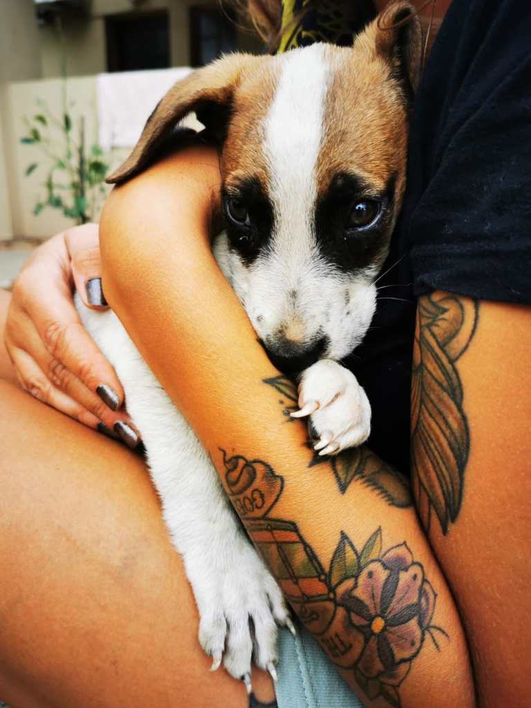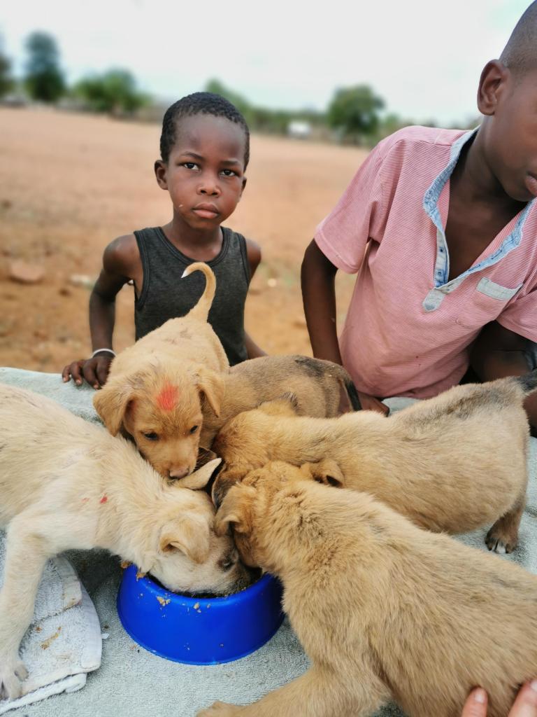 Conclusie over de outreach: het is keihard en een echte rollercoaster van emoties, maar het geeft wel voldoening. Je weet dat je een verschil maakt voor sommige honden, hoe klein dat verschil soms ook is. We nemen vandaag 4 honden mee: Bushy is een teefje dat een tijd geleden bevallen is en er is een dode foetus in haar blijven zitten. Die moet operatief verwijderd worden en dan kan ze weer naar huis. Tau (zijn naam betekent leeuw) is een jongvolwassen reu met een gebroken achterpoot, en ook de kleine Bruno heeft een gebroken achterpootje. Deze twee zullen een hele tijd bij ARRC moeten blijven om te herstellen. En dan is er nog Max. Max werd samen met nog andere pups door een onverschillig joch naar de outreach gebracht om na te kijken. We zagen meteen dat het niet goed ging met deze kleine pup. Ze zakte lusteloos door haar pootjes, wilde niets eten, en toen we haar temperatuur namen bleek ze 41 graden koorts te hebben. We denken meteen aan parvo, de ziekte waar Bean aan overleed. Sam maakt het kind duidelijk dat we deze puppy moeten meenemen, dat we ons best zullen doen maar dat het mogelijk is dat ze zal sterven. Het kind haalt zijn schouders op.