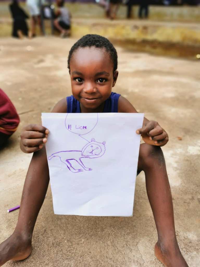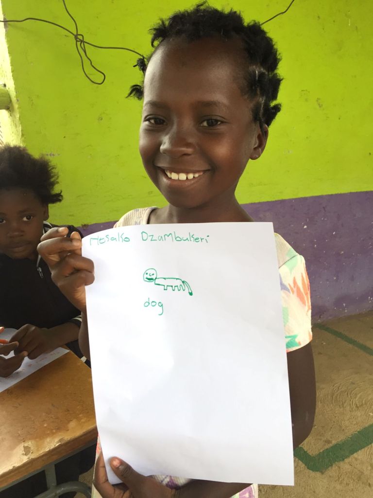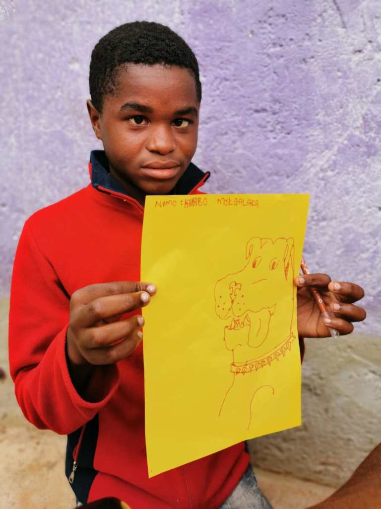 Op woensdag bij het Mohlanatsi project hebben we tekengerei bij voor de kinderen. Ze krijgen de opdracht om een dier te tekenen en daarover een verhaal te schrijven. De kinderen gaan druk aan de slag. We zien de raarste creaturen passeren: leeuwen die niet op leeuwen lijken, krokodillen met 8 poten, giraffen met obesitas… één jongen springt eruit. Hij heeft autisme en leerproblemen, maar uit de hond die hij heeft getekend blijkt dat hij een natuurtalent is.