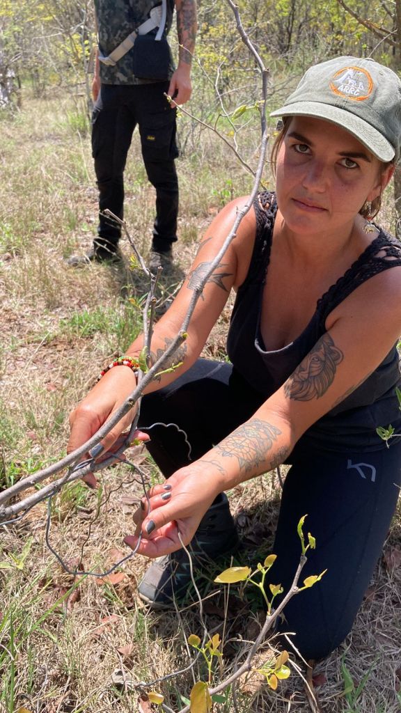 We worden afgezet op de locatie, krijgen een briefing en dan wandelen we in een rechte lijn, op ongeveer 10 meter van elkaar de bush in. Een paar meter voor ons lopen gewapende rangers.