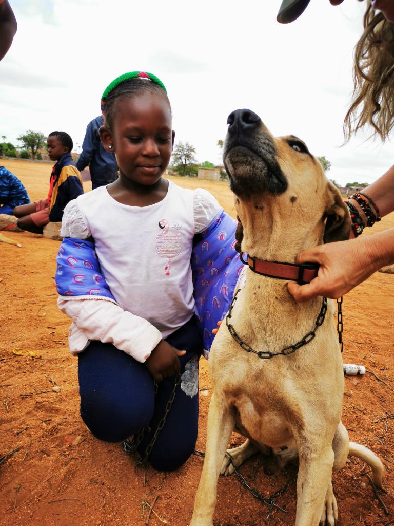 Geregeld komt iemand al een hond op de tafel zetten terwijl je nog met de vorige bezig bent. Ze komen langs alle kanten, aanschuiven en je beurt afwachten is hen totaal vreemd. Om gevaarlijke situaties te vermijden moeten we streng zijn, je weet nooit hoe een hond op een andere hond of persoon reageert. Het eerste wat we vragen als iemand zijn hond op de tafel zet is of hij vriendelijk of boos is. Vaak antwoorden ze dat het een boze hond is, terwijl dat helemaal niet waar blijkt te zijn. De meeste honden die we onderzoeken zijn vriendelijk, vaak iets te onderdanig zelfs. Het is een dag die veel gemengde gevoelens met zich meebrengt. We zien veel schrijnende gevallen: hondjes die veel te mager zijn, mensen die van een ketting of dun koord een leiband hebben gemaakt, mensen die hun hond slaan, kinderen die hen bij hun oren meetrekken of aan hun nek optillen. We proberen hen bij te brengen dat ze lief moeten zijn voor hun hond, dat hun hond goed eten moet krijgen, dat hij anders heel ziek kan worden… het is de vraag of het doordringt. Opvallend is dat vooral de kinderen vaak slecht omgaan met de dieren. Je zou het net andersom verwachten maar helaas is het niet zo. Je probeert hen dan te vertellen dat die hond hun beste vriend zou kunnen worden als ze er lief voor zijn. Dan knikken ze maar tegelijkertijd staan ze wat te lachen. Heel frustrerend. Daarom is het goed wat we met het Mohlanatsi Childrens Project doen. Ik weet zeker dat ze niet allemaal het licht zullen zien, maar bij sommigen zal er wel een kwartje vallen en alle beetjes helpen.