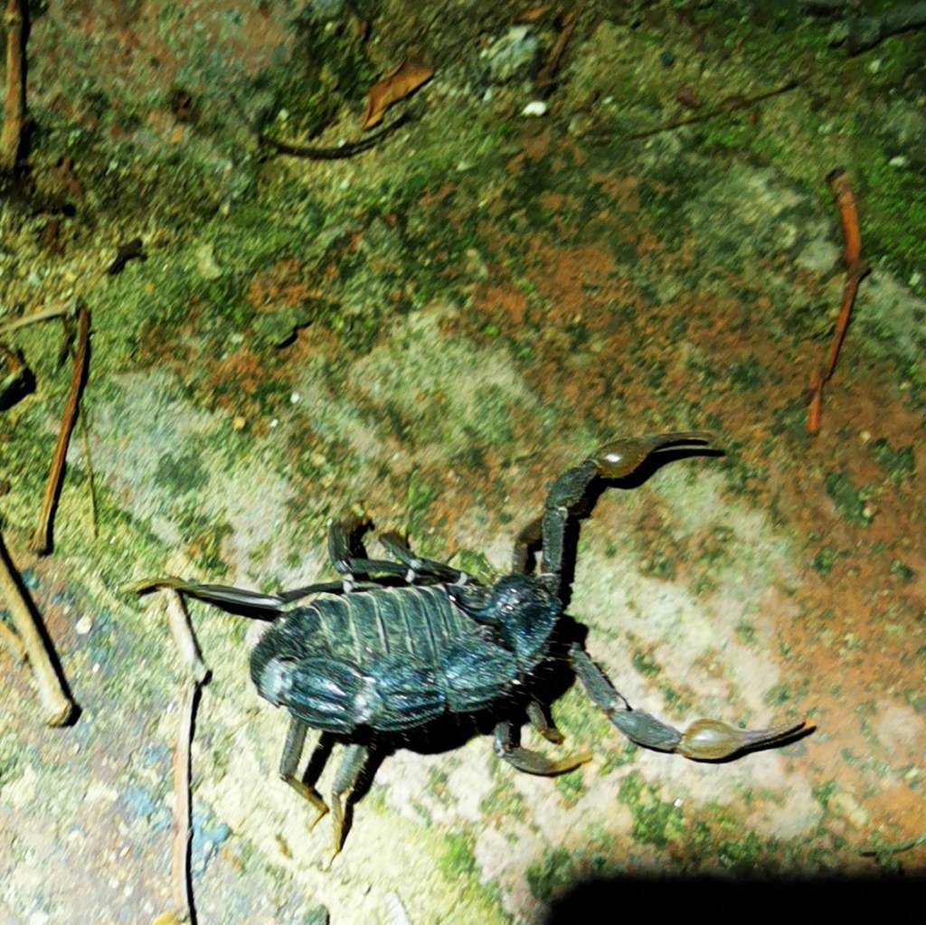 Op de avond dat Tracey’s vrienden Mick, Ian en Debbie (we noemen haar Deb) aankomen voor een bezoek van een paar dagen, zien we bij de braai een schorpioen. En ook al geen lieverdje. Het is er eentje met kleine scharen en een dikke staart, de giftigste soort dus. Nog andere vreemde insecten passeren de revue, maar gelukkig wordt het de komende dagen weer wat droger en zullen ze zich hopelijk weer wat meer gaan verschuilen.
