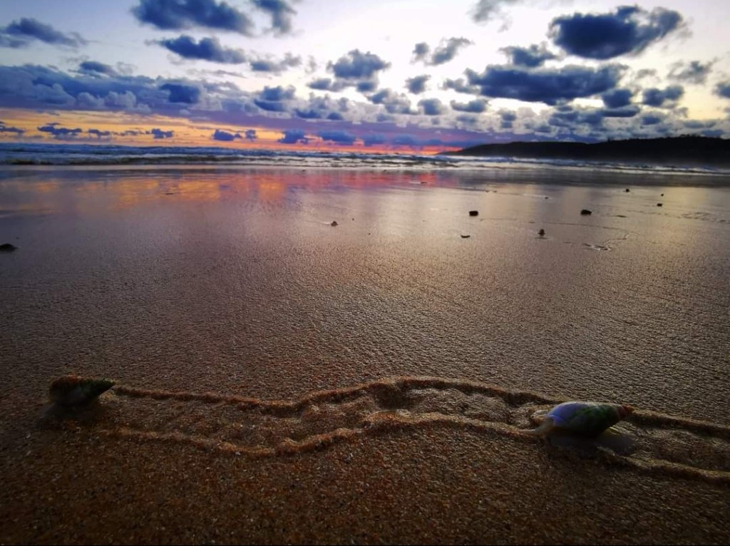 Er is ook een getijdenpoel waar je in kan zwemmen zodra de zee zich terugtrekt.  Het is in deze getijdenpoel dat we een bijzondere ontmoeting met een octopus hadden.  Het was eerst even schrikken toen we in het water stapten en het achtpotig dier zich wel heel nieuwsgierig en vrijpostig opstelde en zijn zuignappen aan onze benen vastzoog.  Nadat we ontsnapt waren en even hadden opgezocht of dit soort octopus gevaarlijk zou kunnen zijn (gelukkig niet), liet ik mijn hand in het water zakken dichtbij de plek waar onze vriend zich inmiddels had verstopt.  Opeens kwam er heel zachtjes een tentakel richting mijn hand, en heel voorzichtig draaide die zich zachtjes om mijn vinger, om daarna terug los te laten, alsof hij gewoon even hallo wilde zeggen.  Wat een bijzondere ontmoeting!