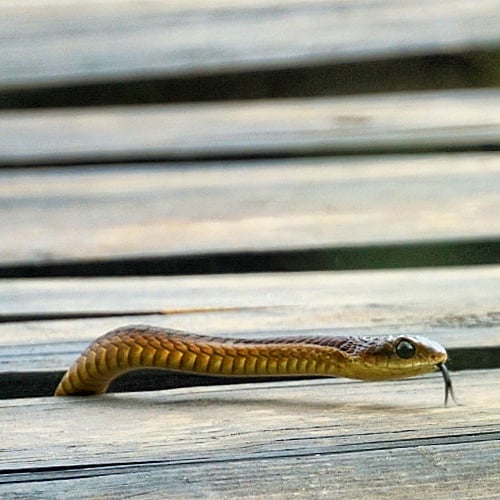 Wanneer we op onze laatste dag na een lange wandeling willen gaan zwemmen, wacht ons een onverwachte verrassing.  Een lange, donkere, slanke gestalte glibbert haar weg door het water, over één van de kajaks en op de steiger.  Het is een vrouwelijke boomslang, een uiterst giftige, maar niet agressieve slang.  Wanneer ze ons opmerkt verstopt ze zich meteen onder de planken van de steiger, en af en toe steekt ze haar kopje boven om te kijken of we er nog zijn.  Ze is prachtig en fascinerend om te observeren.  Uiteindelijk raakt ze het spelletje moe en ze begint zich zelfzeker te bewegen over de steiger.  We geven haar de ruimte zodat ze een uitweg kan vinden en ze laat zich soepel in het water zakken en zwemt naar de kant, waar ze zich verschuilt in het rietbos.