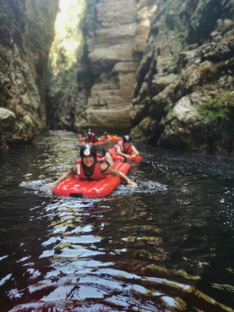 Op een gegeven moment kom je bij rotsen waar je niet meer verder kan.  Je legt je kayak aan en klimt over de rotsen.  Aan de andere kant liggen de lilo’s te wachten.  Lilo’s zijn een soort van harde en stabiele luchtmatras.  Met de lilo’s krijgen we tijd om het ondiepe water achter de kloof te verkennen.  Als we weer terug richting het vertrekpunt drijven, krijgen we de kans om van een 4 meter hoge rots te springen.  Onze gids Ronny stelt ons gerust: het is veilig om te springen, het water is hier 10 meter diep.  De andere gids Mdu klimt alvast op de rots om degenen die willen springen erop te helpen.  Robbie en een andere jongen van de groep gaan eerst.  Ik ben een eeuwige twijfelaar en ook wel bangerik met zo’n dingen, maar ik besluit toch om te springen en ben heel blij dat ik het gedaan heb!  Uiteindelijk is in je comfortzone blijven toch nergens goed voor nietwaar?