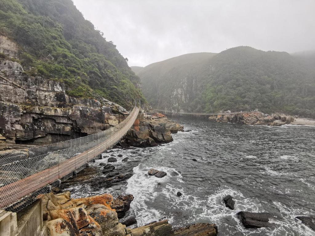 Net toen we dachten dat we al wel genoeg verwend waren geweest met natuurschoon, kwam dit op  ons pad.  Nature’s Valley en het nabijgelegen Tsitsikamma National Park zijn van een adembenemende schoonheid.  Het Tsitsikamma National Park is in 2009 gefuseerd met het Wilderness National Park en het Knysna National Park om samen het Garden Route National Park te vormen.  De naam Tsitsikamma betekent “plaats van veel water”, en dat klopt ook.  Terwijl de bossen zich uitstrekken langs de woeste kustlijn en haar helderblauwe golven, slingeren ze net zo goed om en langs de donkere Storms rivier.