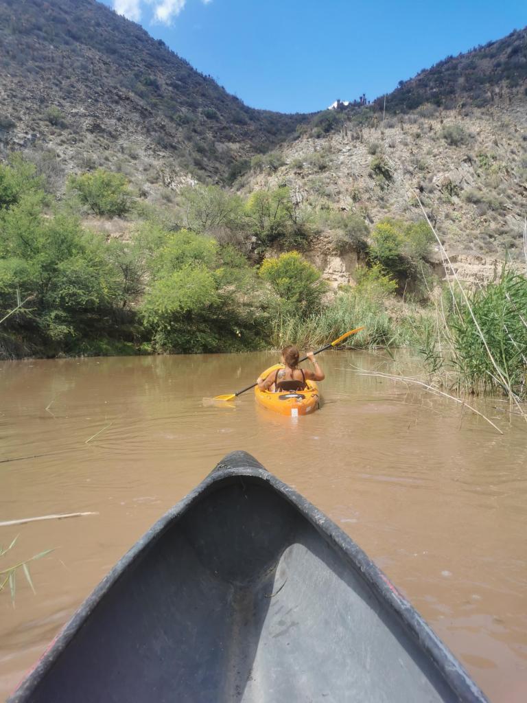 Wanneer ik na het kayakken mijn waterfles in de rivier laat vallen, vrees ik dat ik ze nooit meer terug zal zien.  Maar we hoeven het maar één keer te vermelden of de jongens zien er een leuke uitdaging in.  Berkely duikt één keer en zegt dat hij denkt dat hij de fles gevoeld heeft.  Na de tweede duik haalt hij ze boven!  Het water is diep, bruin en ondoorzichtig, maar deze jongens zijn zo goed als opgegroeid in deze rivier, ze zwemmen dagelijks vanaf ze dat op jonge leeftijd geleerd hebben en ze kennen de rivier en haar rotsachtige bodem door en door.  Wat een fantastische manier om op te groeien!