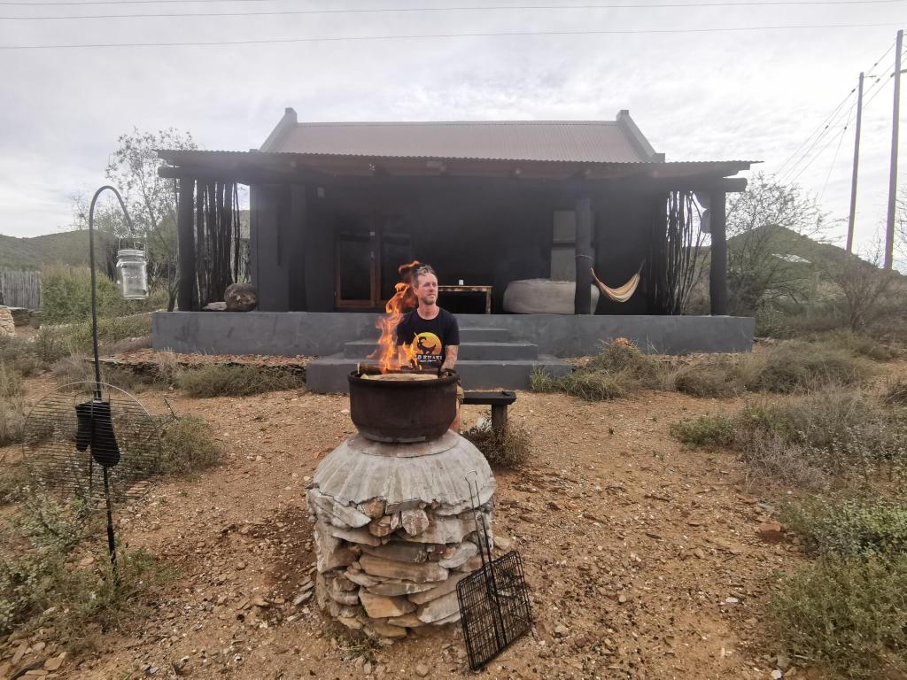 Bronwyn en Colin zijn 21 jaar geleden van Capetown naar hier verhuisd, en ze hebben werkelijk een stukje hemel op aarde gevonden.  Op 100 meter van hun eigen huis, hebben ze 3 kleine cottages gebouwd die ze verhuren als Airbnb.  Als je het gastenboek bekijkt zijn de huisjes bijna altijd verhuurd, maar momenteel zijn wij de enige gasten die hier verblijven.  Er zijn eigenlijk geen woorden voor deze plek, maar ik ga het toch proberen.  De huisjes zijn heel klein, maar je hebt alles wat je nodig hebt.  Buiten is een porch, of een stoep zoals het hier genoemd wordt, met een waanzinnig zicht op de rivier beneden en op de bergen.  Elk huisje heeft zijn eigen braai en op het enorme domein staan nog verschillende plekken waar je kan braaien of een kampvuur kan maken.